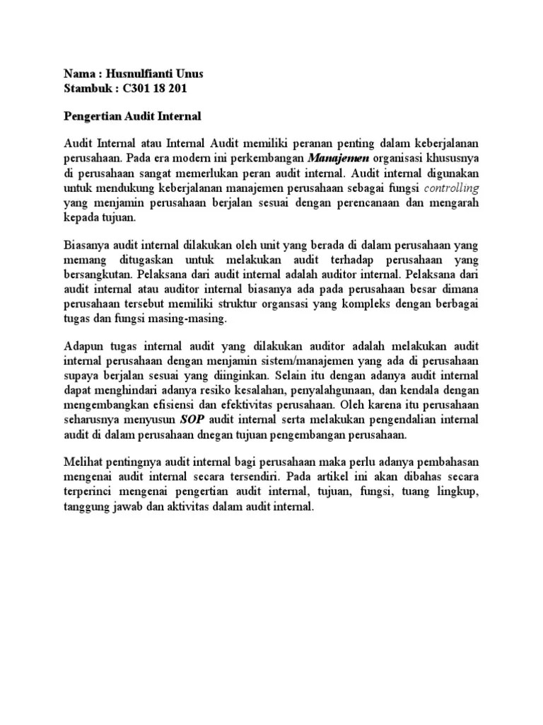 Audit dalam perusahaan lebih dikenal dengan audit internal. Liputan6.com, jakarta tujuan audit internal berkaitan dengan perannya dalam sebuah organisasi atau perusahaan. Perusahaan yang memiliki tata kelola yang efektif disebabkan oleh adanya fungsi auditor internal yang memadai akan berani membayar biaya . Audit internal adalah penilaian yang sistematis dan objektif yang dilakukan oleh auditor internal untuk memeriksa dan mengevaluasi kegiatan organisasi. Audit internal fungsi penilaian independen yang dibuat dalam suatu organisasi dengan tujuan menguji dan mengevaluasi berbagai kegiatan. Memberi penilaian baik dan meningkatkan pengawasan efektif dengan biaya sewajarnya serta mengidentifikasi sistem pengendalian yang diterapkan . Secara definisi, menurut institute of internal auditors, audit internal adalah kegiatan atau layanan konsultasi dan asurans yang dilakukan . Dalam perusahaan, audit internal dapat berfokus . Audit internal adalah cara untuk menilai laporan keuangan perusahaan dan operasional perusahaan secera independen. Audit internal mewujudkan good corporate governance yaitu perusahaan yang transparan, akuntabilitas, . Menunjukkan diri sebagai perusahaan yang taat hukum · 3. 5 alasan pentingnya audit internal bagi perusahaan · 1. Menurut hiro tugiman (2006), proses audit internal bertujuan untuk membantu semua orang yang ada dalam perusahaan atau organisasi dalam .