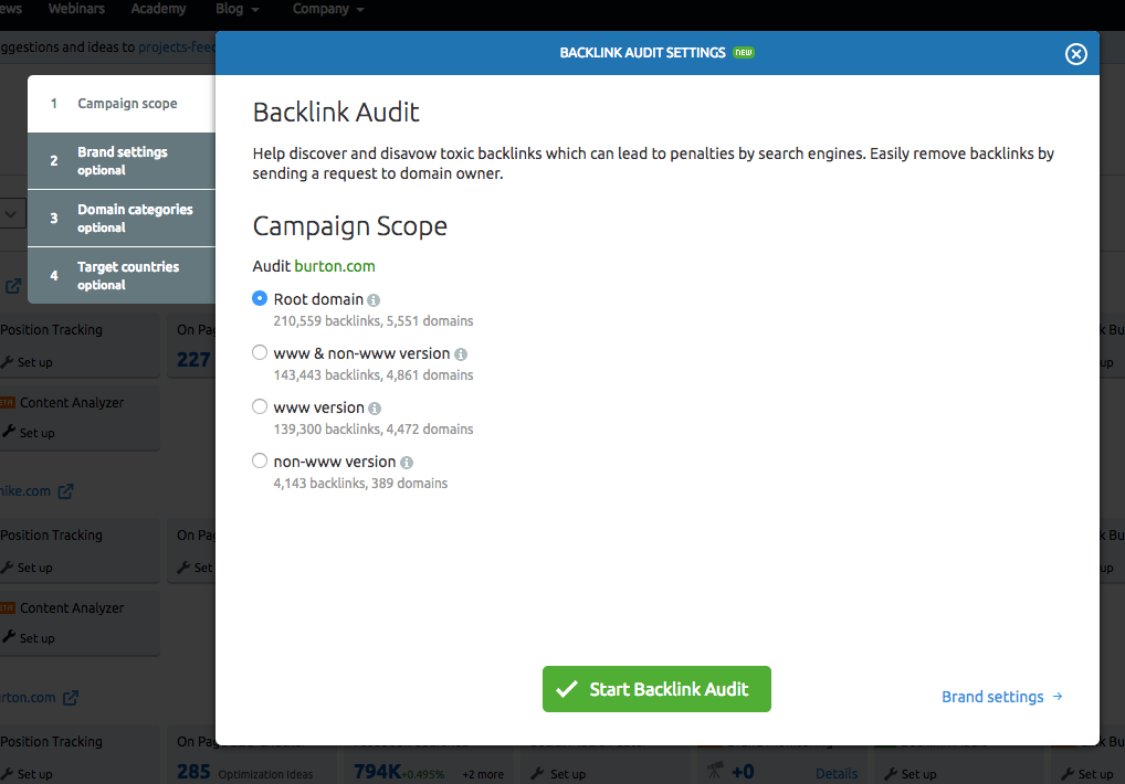 Setting up your domain and brand settings is key for semrush to be able to pull the most accurate results for your backlinks.